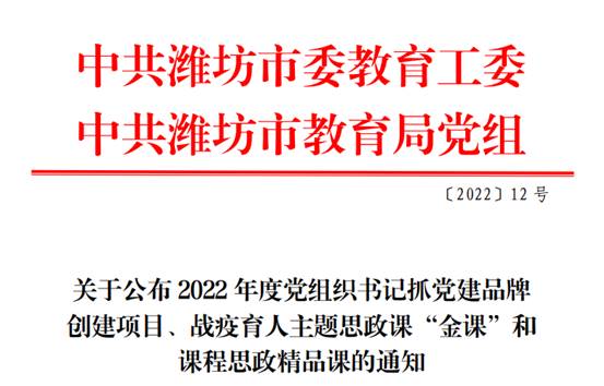 2022年5月13日,中共潍坊市委教育工委和中共潍坊市教育局党组发布《关于公布2022年度党组织书记抓党建品牌创建项目、战疫育人主题思政课“金课”和课程思政精品课的通知》。其中,确定优秀思政课“金课”72节和课程思政精品课65节。其中,我校基础教学部马玉彤教学团队的《伟大抗疫精神——举国同心,舍生忘死》、管理工程学院楚红兰教学团队的《战疫情保民生,物流运输在行动——公路与航空运输》分别入选潍坊市战疫育人主题思政课“金课”和潍坊市战疫育人主题课程思政精品课。