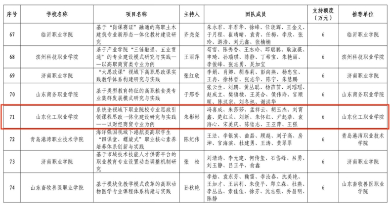 由朱彬彬主持的项目《系统论视域下职业院校专业思政引领课程思政一体化建设研究与实践——以财经商贸专业为例》,由方黎洋主持的项目《产业贡献度视域下高职院校分类增值性评价研究与实践》,由丁竹青主持的项目《生源多样化背景下高职电气专业分类分层人才培养模式研究与实践》成功入选2022年山东省职业教育教学改革研究项目,共获批研究经费10万元。