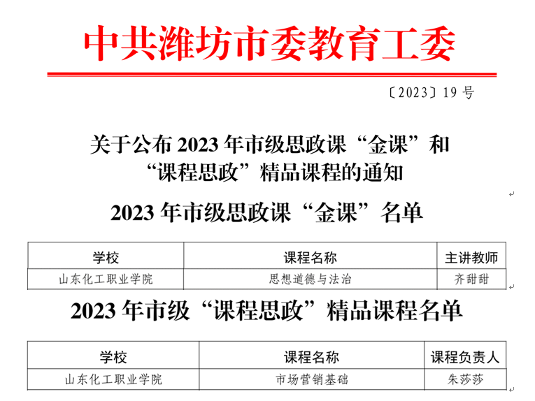 近日,中共潍坊市委教育工委发布《关于公布2023年市级思政课“金课”和“课程思政”精品课程的通知》,我校齐甜甜老师主持的《思想道德与法治》课程获得市级思政课“金课”、朱莎莎老师主持的《市场营销基础》课程获得市级“课程思政”精品课程。