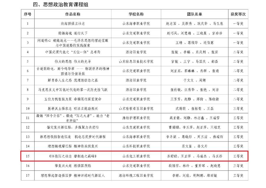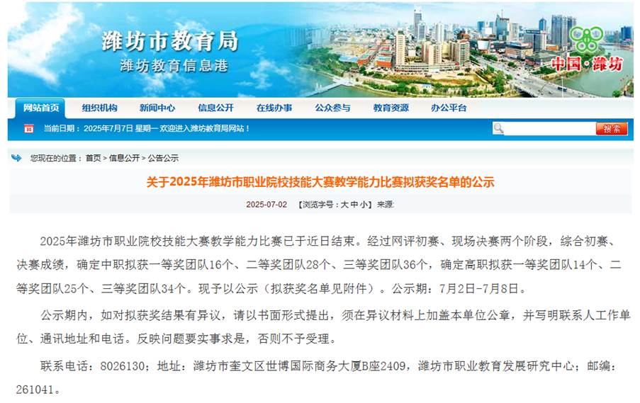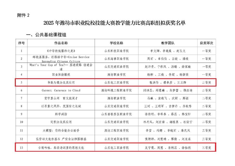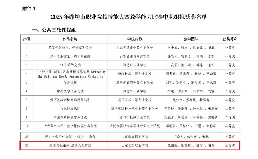 近日,潍坊市教育局对2025年潍坊市职业院校技能大赛教学能力比赛拟获奖名单进行公示,经过专家评选,我校共8个团队获奖,其中高职组获一等奖团队1个、二等奖团队2个、三等奖团队4个,中职组获三等奖团队1个。