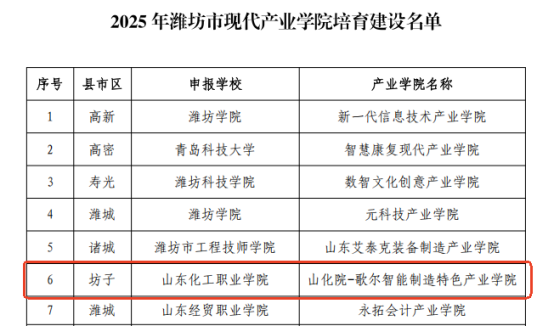 近日,潍坊市现代产业学院建设工作专班办公室发布了《关于公布2022、2023年潍坊市现代产业学院提质培优和2025年潍坊市现代产业学院培育建设情况的通知》,我校与歌尔股份有限公司共建的“山化院-歌尔智能制造特色产业学院”成功入选2025年潍坊市现代产业学院培育建设名单。