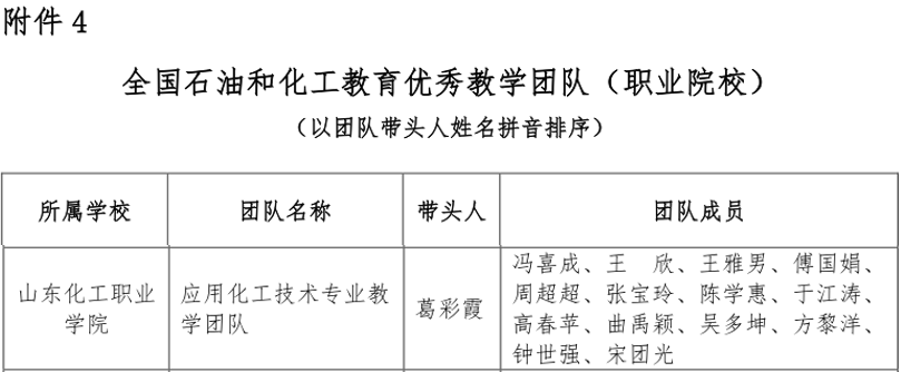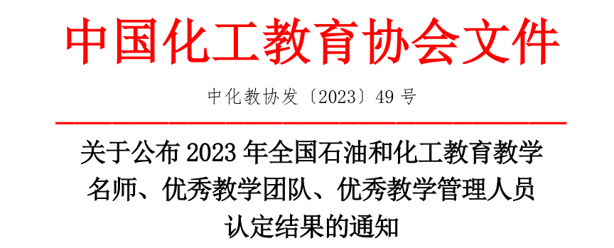 10月12日,中国化工教育协会发布《关于公布2023年全国石油和化工教育教学名师、优秀教学团队、优秀教学管理人员认定结果的通知》(中化教协发〔2023〕49号),我校应用化工技术专业教学团队获批全国石油和化工教育优秀教学团队。