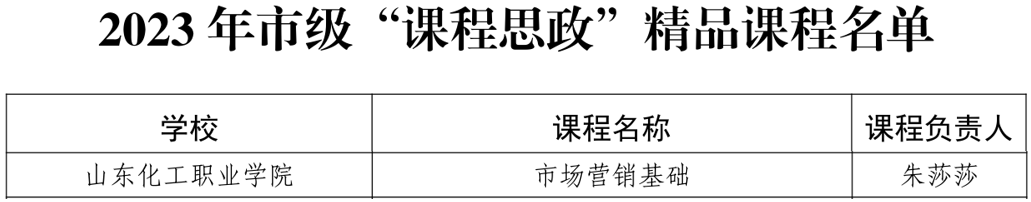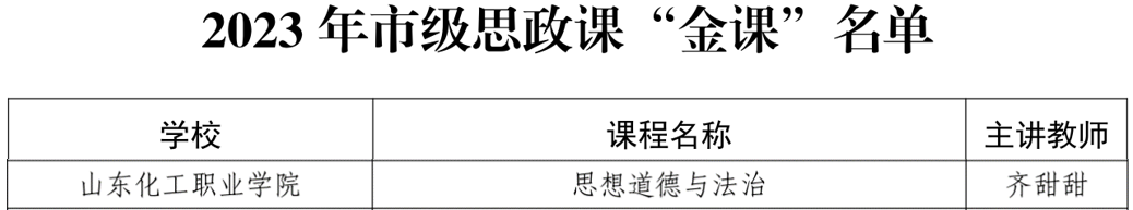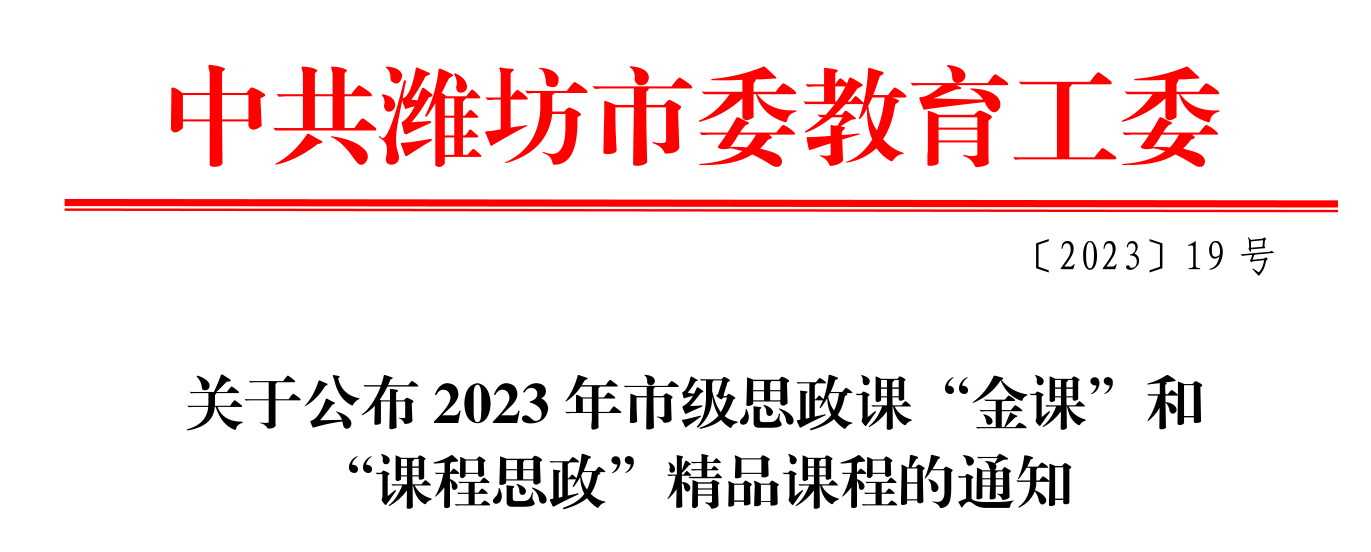 近日,中共潍坊市委教育工委发布《关于公布 2023 年市级思政课“金课”和“课程思政”精品课程的通知》,我校齐甜甜老师主持的《思想道德与法治》课程获得市级思政课“金课”、朱莎莎老师主持的《市场营销基础》课程获得市级“课程思政”精品课程。